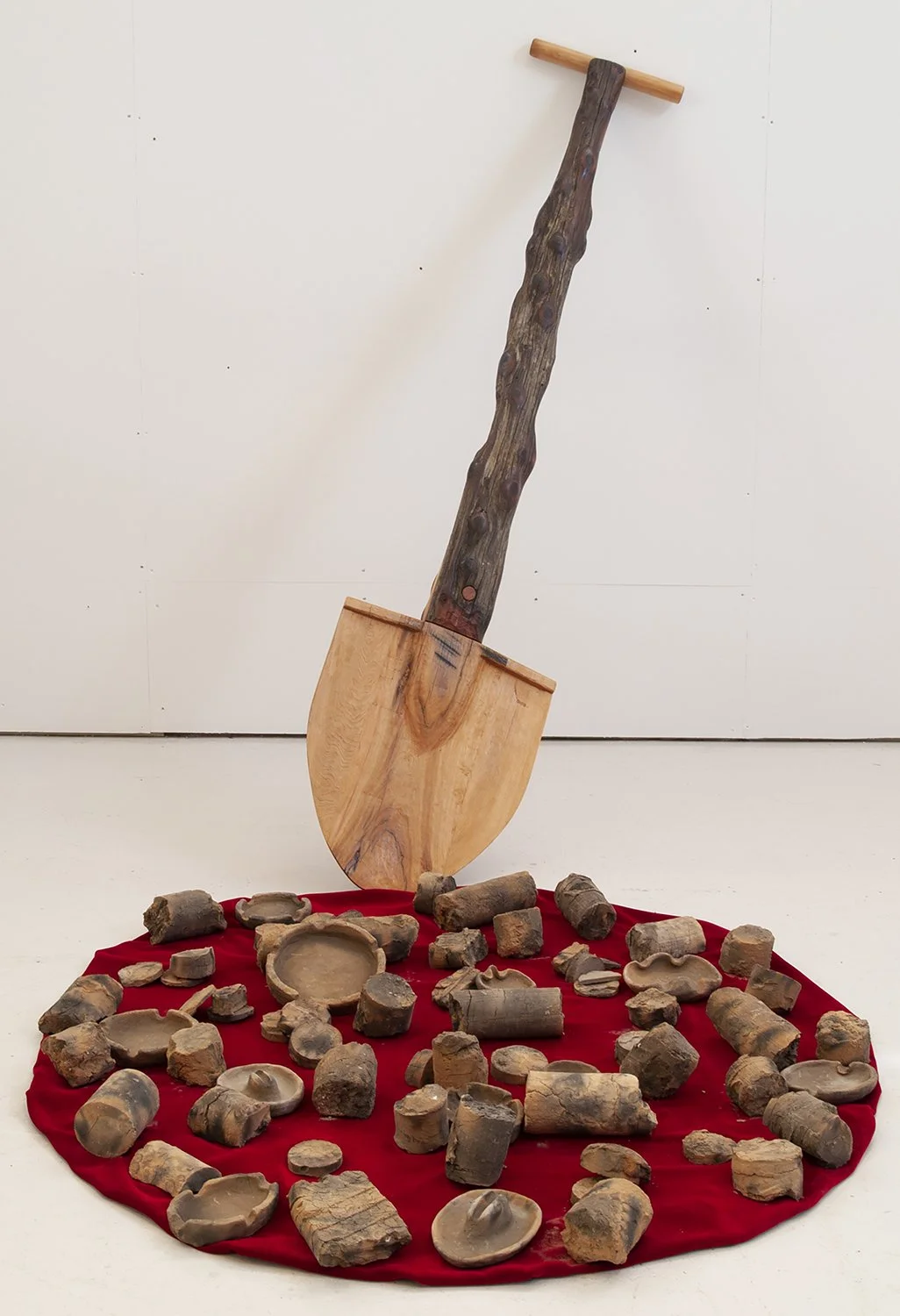 This work is constructed from illuvial clay borings collected from a construction site in uptown New Orleans. (Drill boring involves drilling into the ground, in this case with a 4” pipe, to assess soil quality. This is performed, in our soft landscape, to determine what kind of pilings to use in the foundation of a building). The test borings in this project document what’s in the ground from the surface to one hundred feet below. The clay is distinctly different at different levels. Some of the borings have been preserved, in found condition, by drying and bisque firing using a primitive method. Some of the clay borings have been rehydrated and constructed into kitschy tourist-ashtrays. The ashtray represents the trashing of our environment; the pieces resemble artifacts and fake Native American pottery shards. The work also includes objects made from reclaimed cypress, the trees of the native landscape.