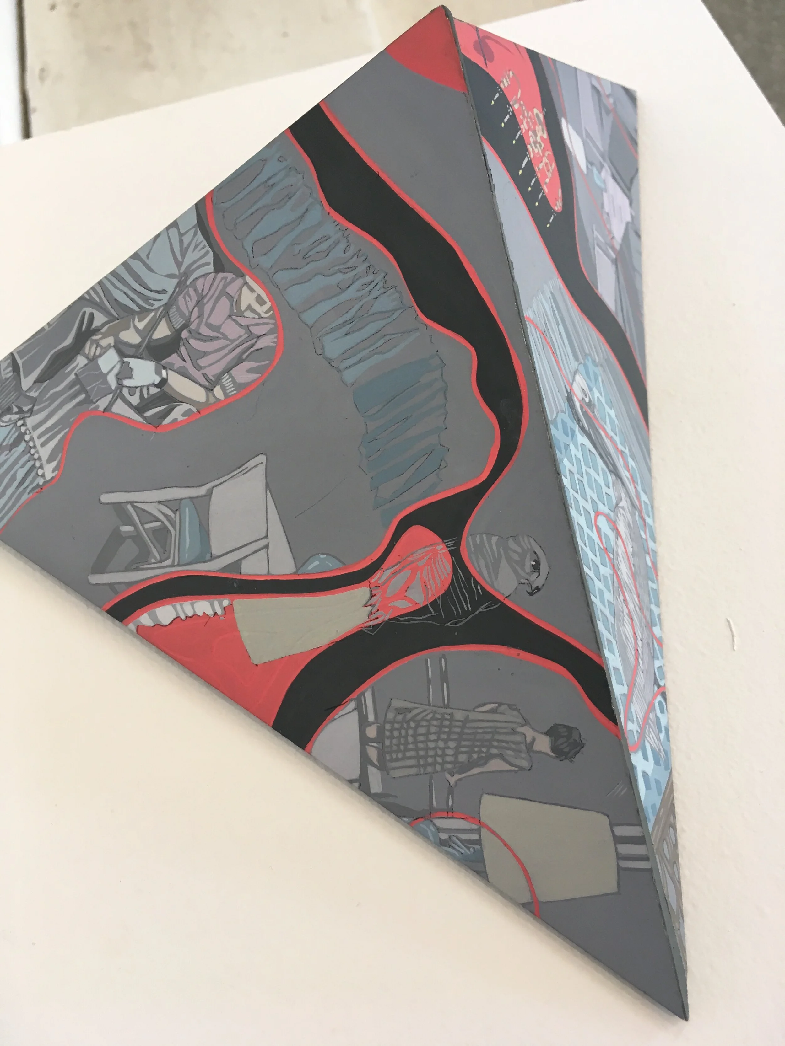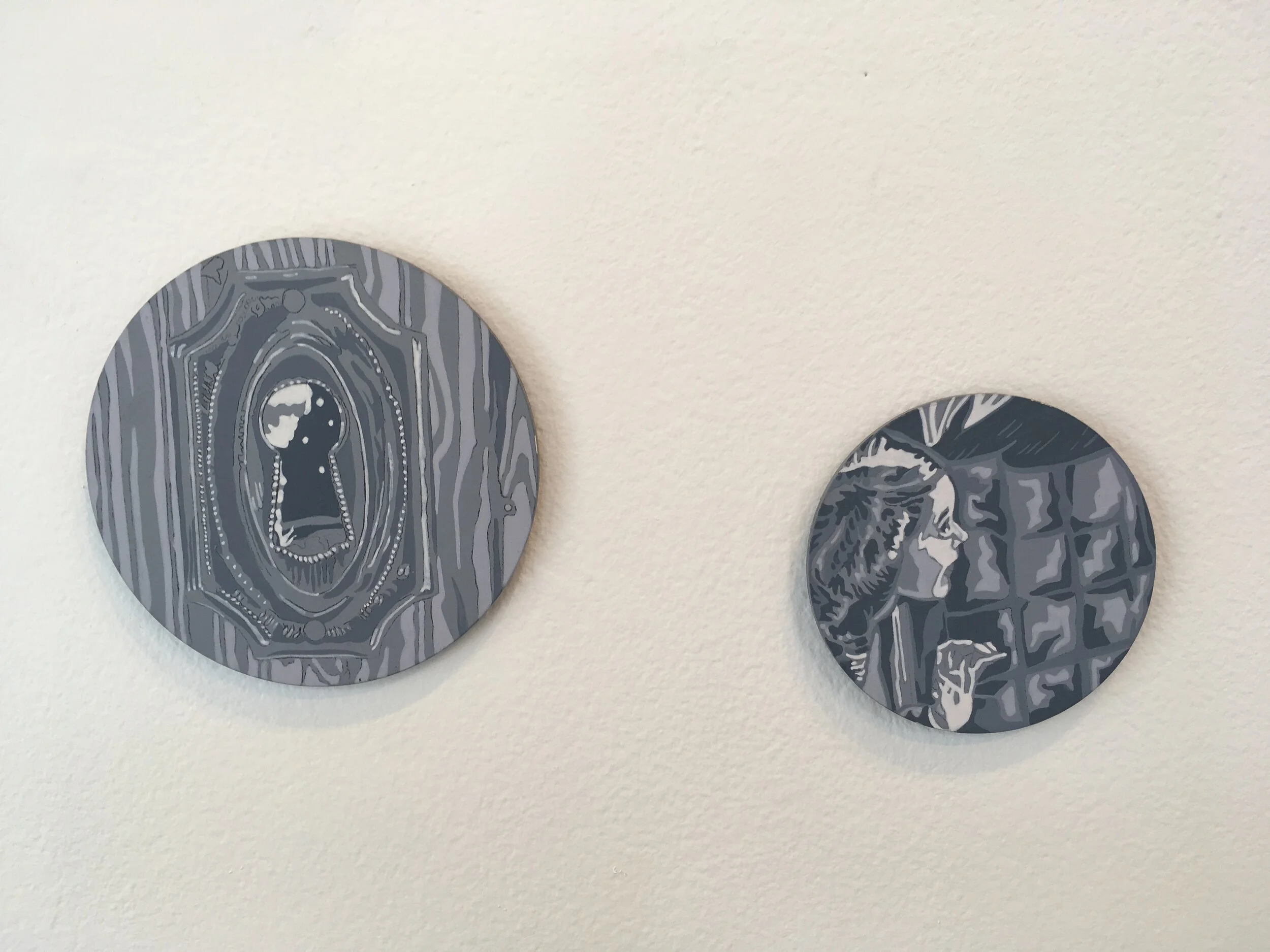 Glass/Vaso is 7” inches diameter and Room 5 is 10” diameter-flasche paint on panel.