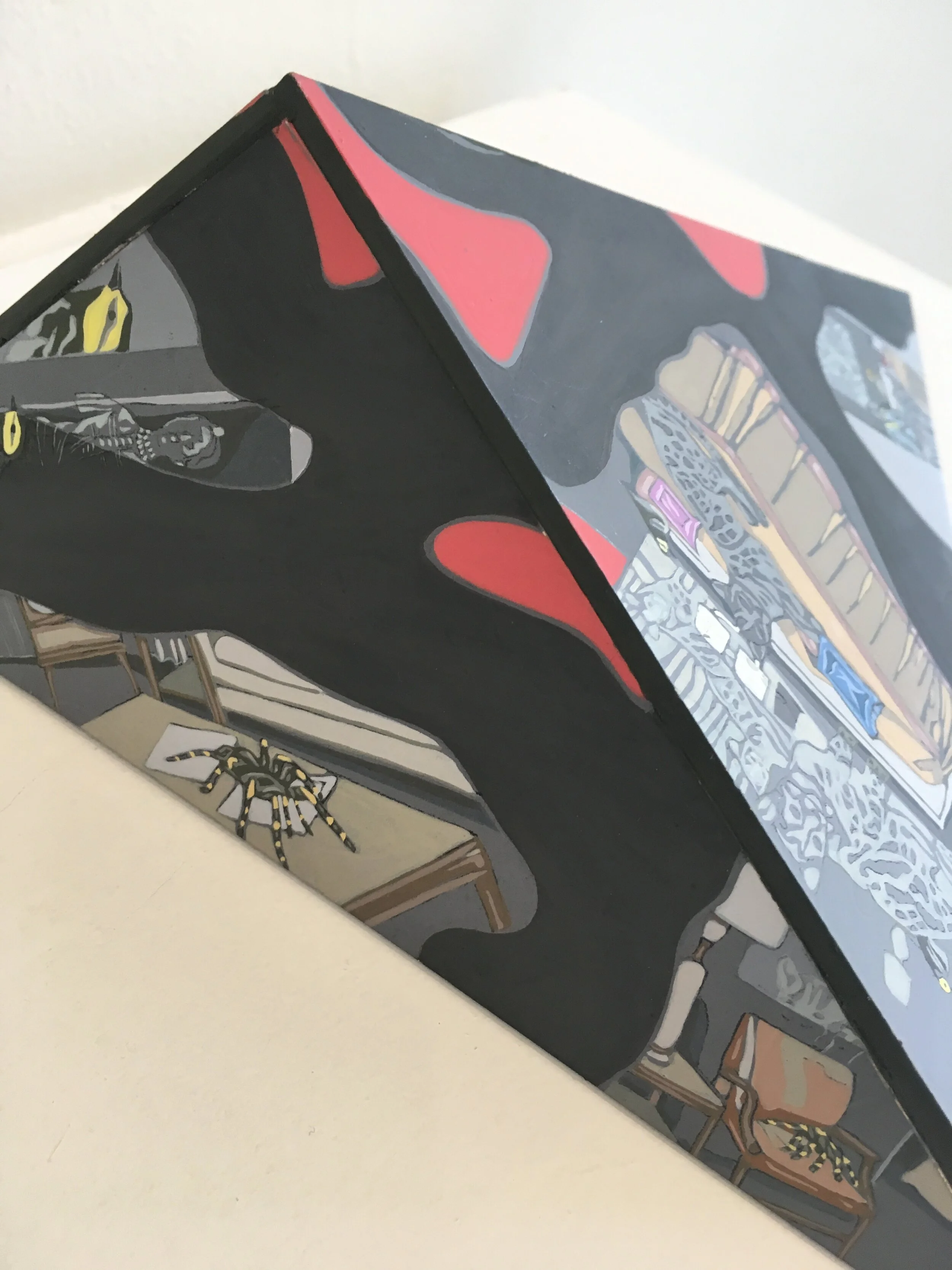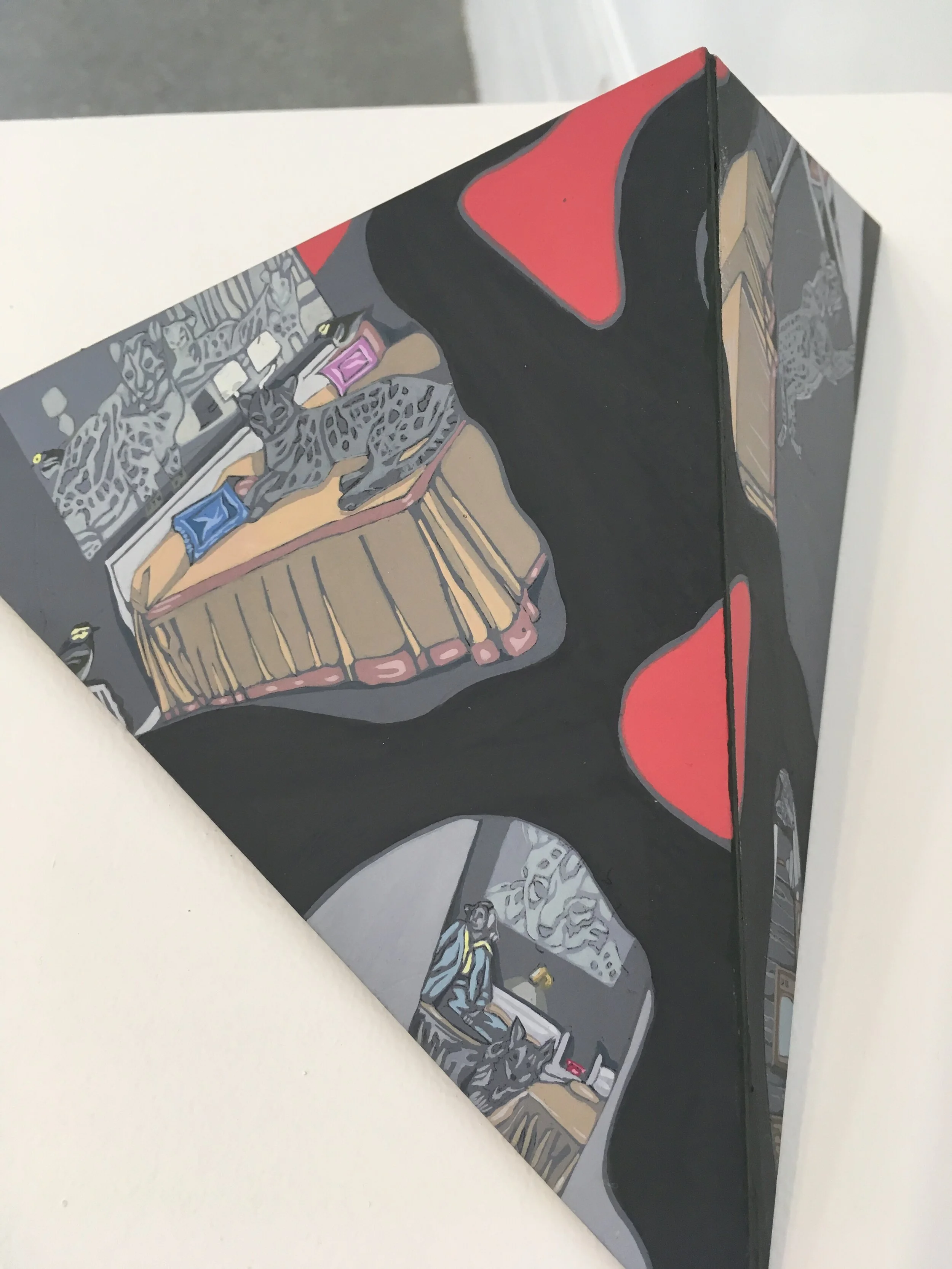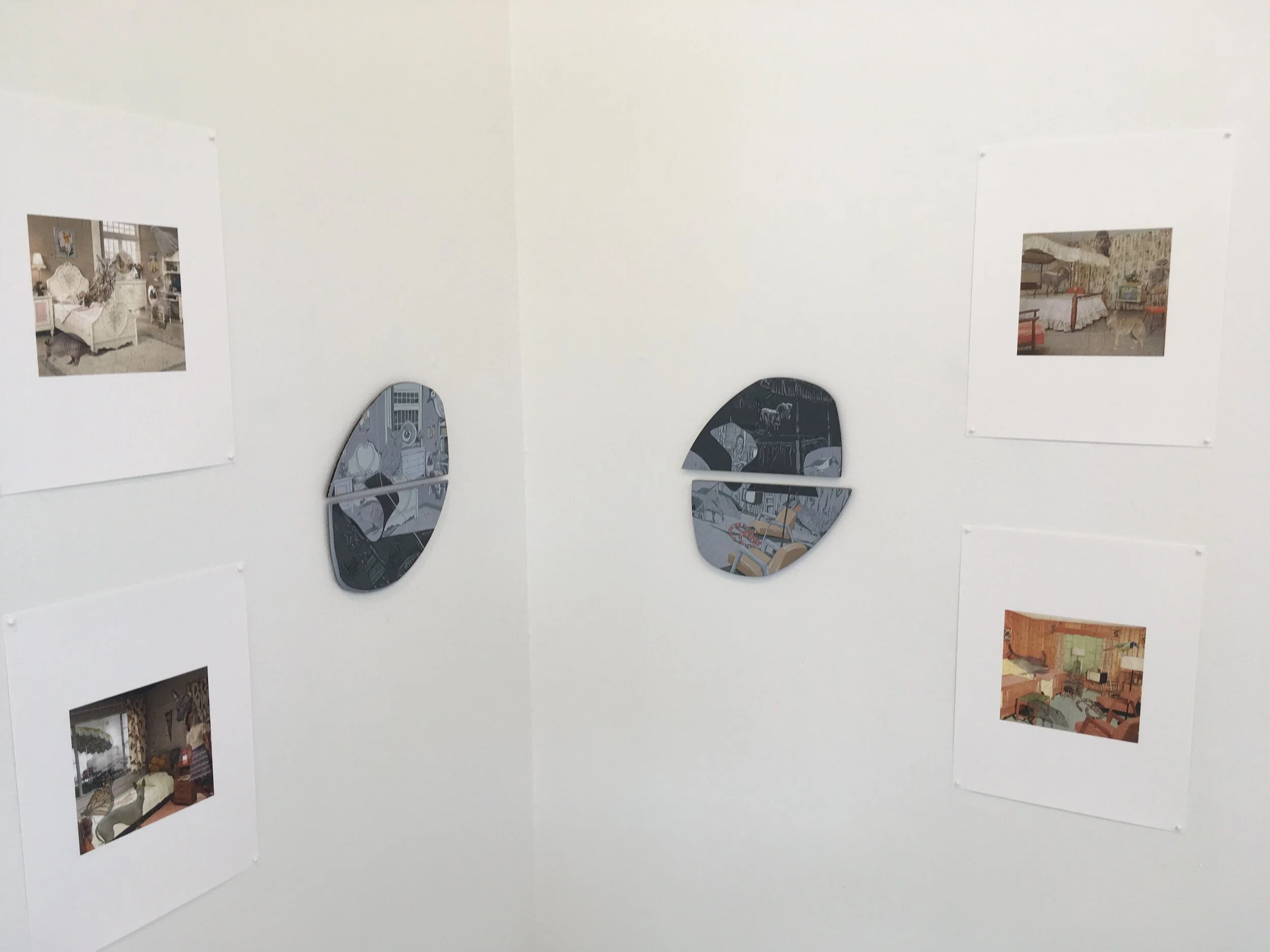 Here you can see the painting of room 5 next to the print of room 5. The prints were the first images to come in this series with subsequent paintings that aim to lose something in translation, also functioning like crime scene photography (closer looking does not always yield the truth). Yellow warbler and jaguarundi.