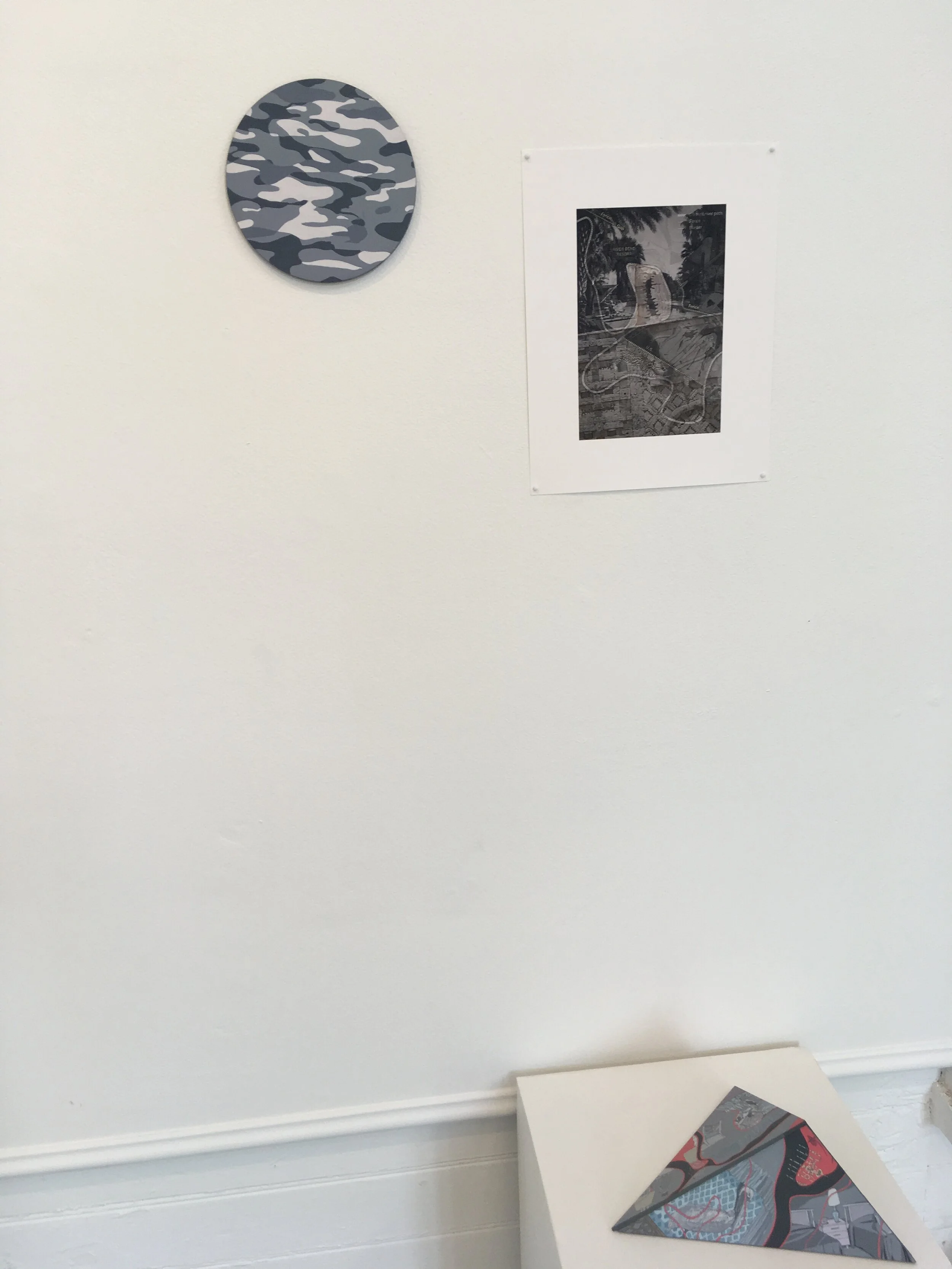 Camo, map, pyramid. Each occupies a tiny space-under 12 inches, like a page or book.