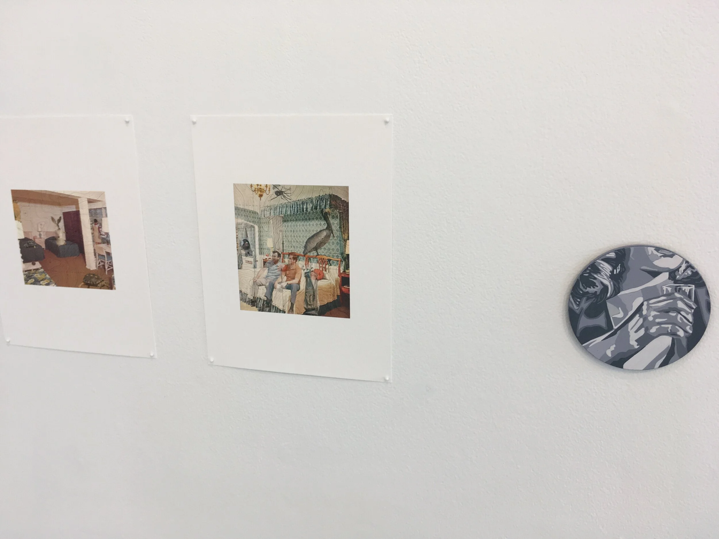 Moving left to right inside the exhibit, there are minglings of photocollage prints depicting individual motel rooms in a phantom, borderland resort and orb-paintings, titled “Hemispheres/Esferas.” All of the titles are in English/Spanish to reflect partitioning of humans, and cordoning of species.